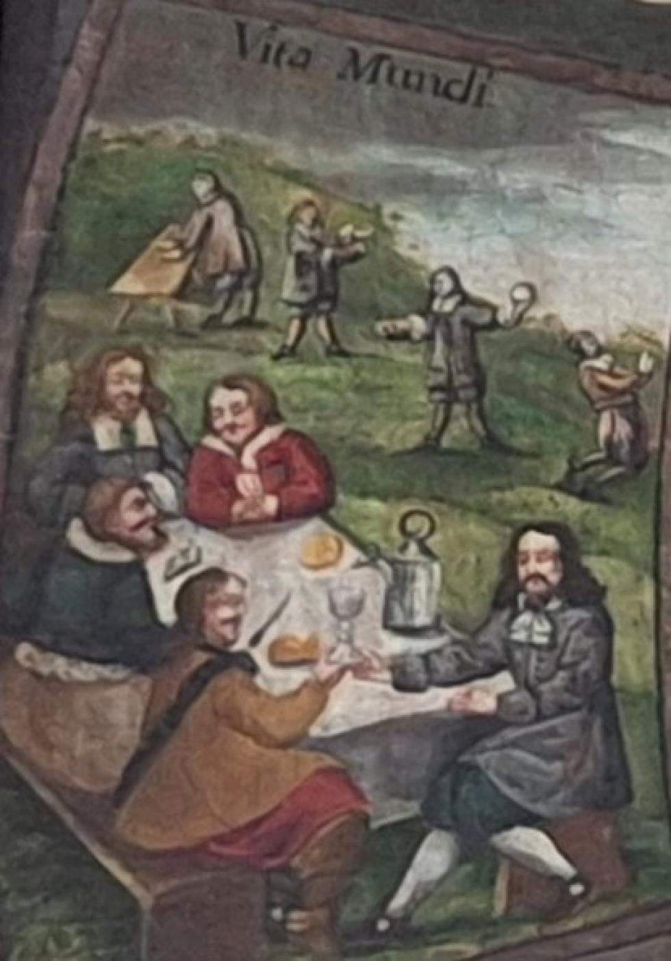 Das Bild in der Mitte links zeigt das irdische Leben (Vita Mundi). In freier Landschaft sitzen fünf Männer an der mit Speis und Trank gedeckten Tafel gemütlich beisammen und pflegen das genüssliche, aber auch sündhafte Leben. Im Hintergrund wird durch vier Männer, anhand ihrer Attribute - Arbeit, Meditation, Gebet ersichtlich, das tugendhafte, gottgefällige Leben dargestellt.