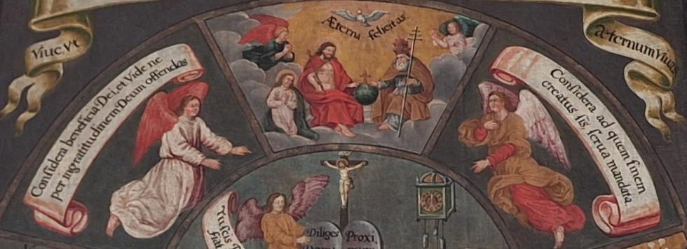 Zuoberst, der Hölle gegenüber, erkennen wir den Himmel (Aeterna Felicitas) und die Drei-faltigkeit, die von zwei anbetenden Engeln auf Wolken umgeben ist. Links unten kniet Maria, die Fürbitterin der Menschen. In der Mitte überstrahlt, beschützt und zugleich beherrscht die Dreifaltigkeit die Weltkugel. Die beiden Engel im Bereich des Himmels mahnen den Men-schen mit ihren Aufrufen, zugleich bezugnehmend auf das Mitteloval, links: «Gedenke der Wohltaten Gottes und achte darauf, dass du nicht mit Undankbarkeit Gott beleidigst», rechts: «Bedenke, zu welchem Ende du geschaffen bist, halte die Gebote».