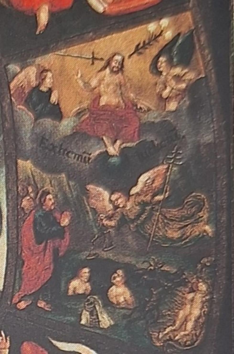Rechts, gegenüber der Vita Mundi erkennen wir das Gericht (Extremú Judiciú). Umgeben von zwei Engeln sitzt Jesus als Weltenrichter, aus dessen Munde Schwert und Palme aus-gehen, d.h. von dessen Aussage Himmel und Hölle abhängen. Erzengel Michael mit der Seelenwaage schwebt über den Toten, links stehen betend die Seligen, stellvertretend eine Person in rotem Überwurf, und rechts öffnet sich der Höllenrachen. Hier entscheidet sich, ob der Tote seine Gesinnung noch ändert und im Fegefeuer verbleibt oder aber in der Hölle landet.