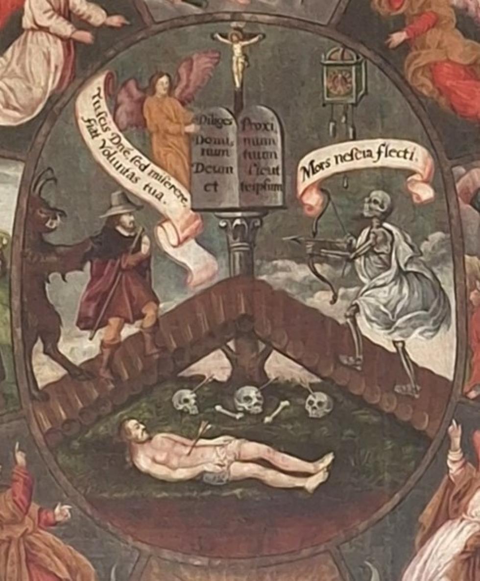 Die beiden Engel im Bereich des Todes sprechen eine klare Drohung aus: links: «Bedenke, woraus dein Körper beschaffen ist, bedenke die ewigen Strafen der Hölle», und rechts: «Bedenke, dass du im Tod dem gerechten Richter Rechenschaft ablegen musst».