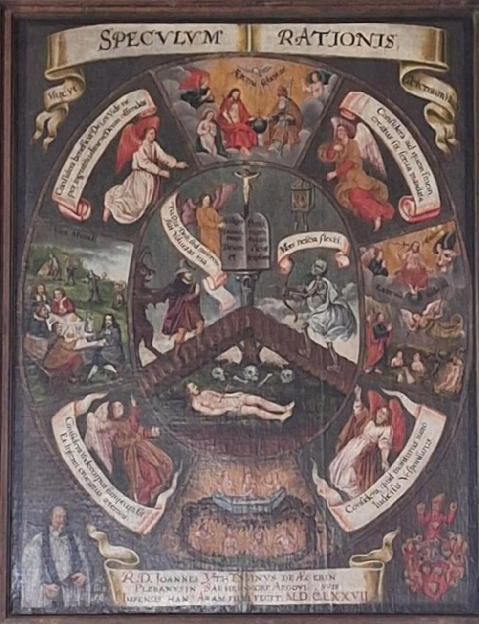 Vor uns haben wir eine Meditationstafel. Es ist ein Aufruf zum heilsamen Wirken, zur Selbsterforschung, zur Selbsterkenntnis, um das ewige Leben zu erlangen.      Von der Form her entspricht sie dem mittelalterlichen ovalen Rundspiegel mit bebildertem Rahmen, obwohl die Tafel erst im 17. Jahrhundert entstanden ist. Eine klar strukturierte Aufteilung von links nach rechts und von unten nach oben zeichnet dieses Gemälde aus.    Das Mitteloval wird von acht Feldern umschlossen, wobei in der Diagonale vier Engel mit Ermahnungen auf Schriftbändern stehen.