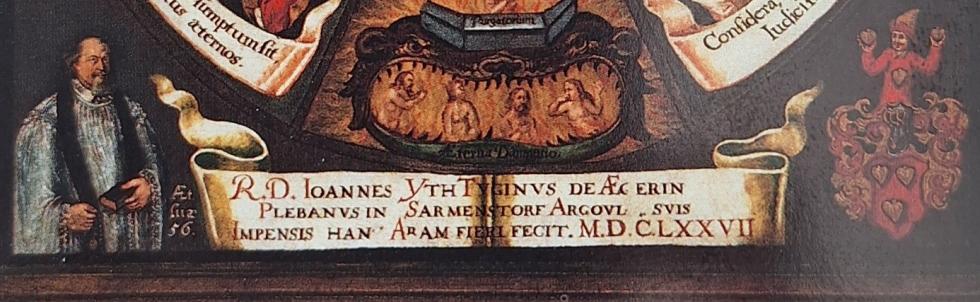 Den Abschluss unten bilden links das Portrait des Stifters, «im Alter von 56 Jahren», rechts sein Wappen, drei Schilde in Rot, und in der Mitte das Band mit der Stifterinschrift: «Der ehr-würdige Johannes Iten, ein Zuger aus Ägeri, Leutpriester in Sarmenstorf, Aargau, liess aus eigenem Vermögen diesen Altar errichten, 1677».